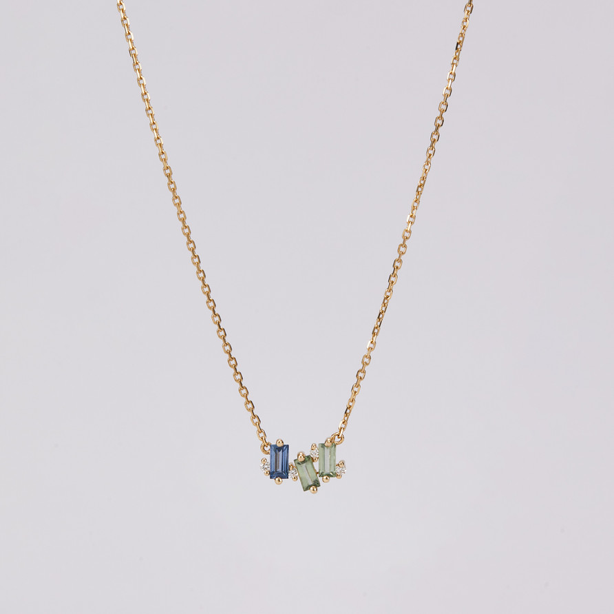 A sleek row of baguette-cut ice-toned sapphires set in solid gold. The only kind of ice you’ll want on your neck.